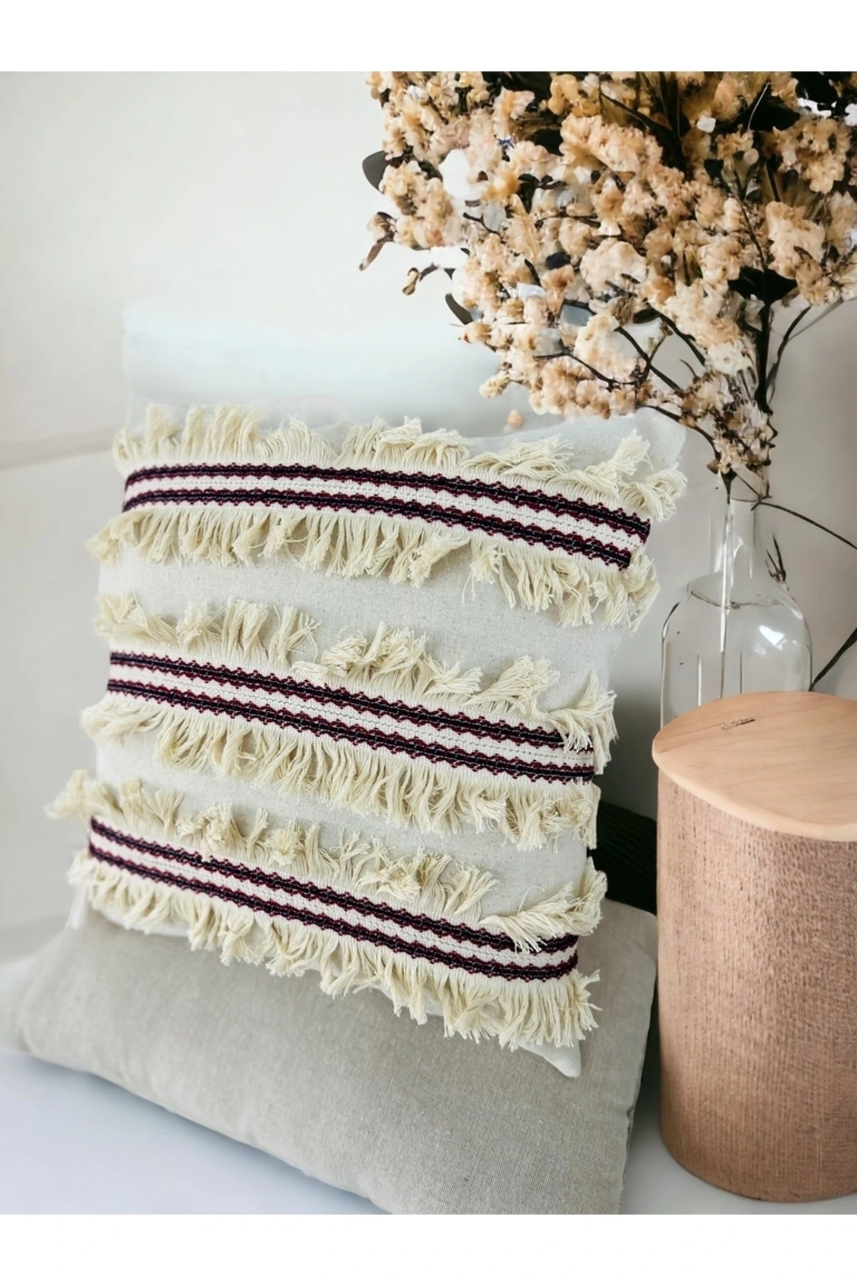3Püsküllü Ara Desenli Keten Krem Kırlent Kırlent Kılıfı