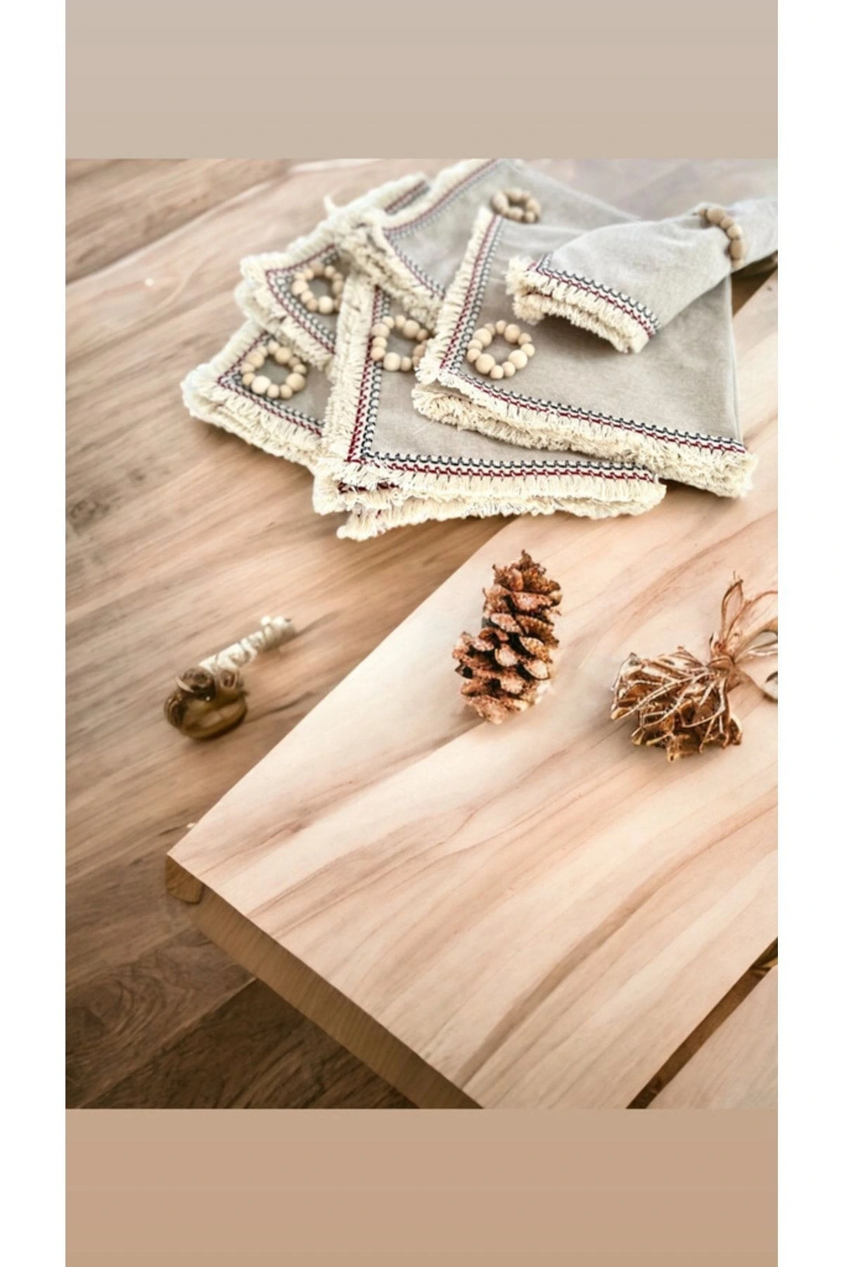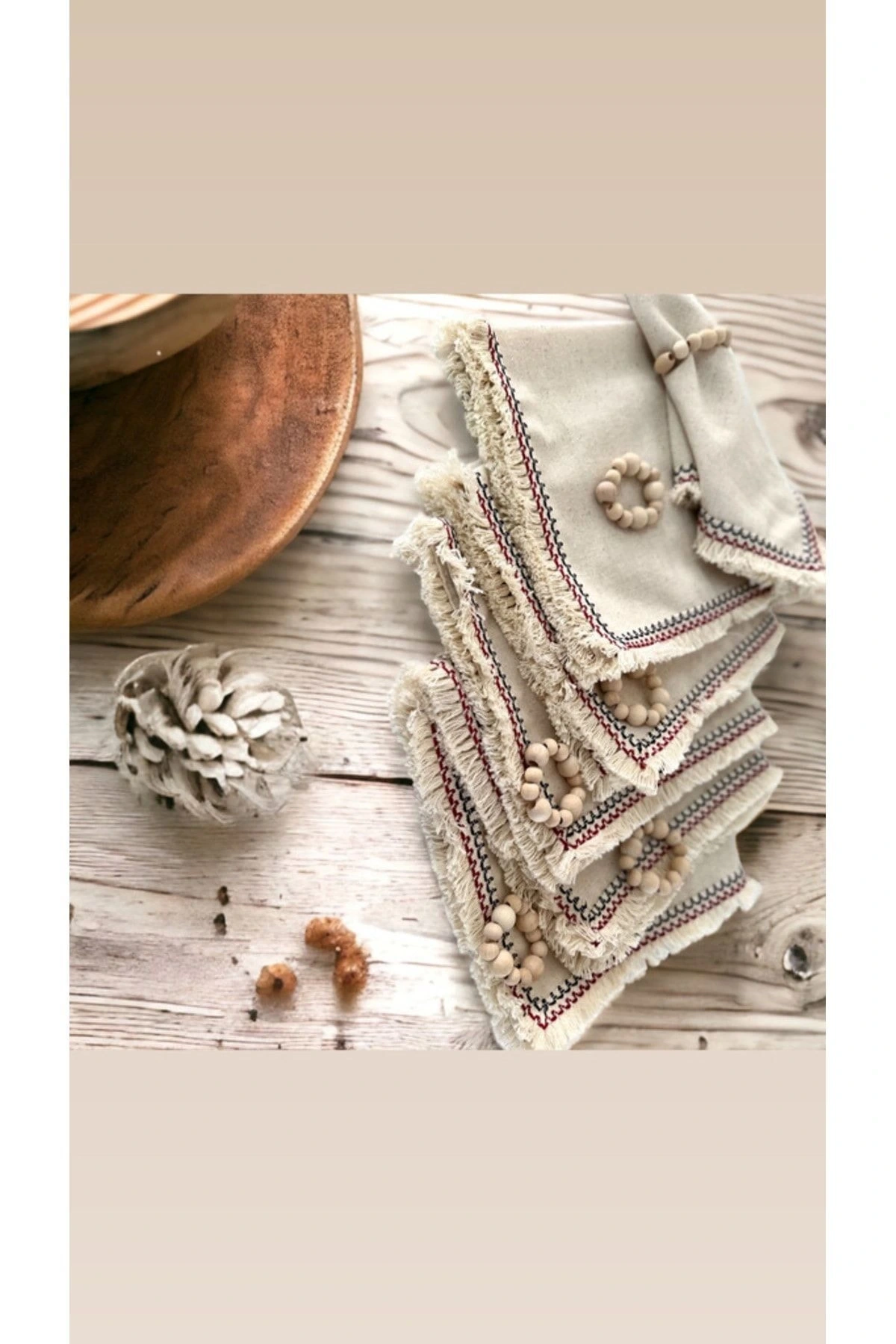 6LI Mini Püsküllü Ham Keten Peçete Takımı (AHŞAP TOKA HEDİYELİ)