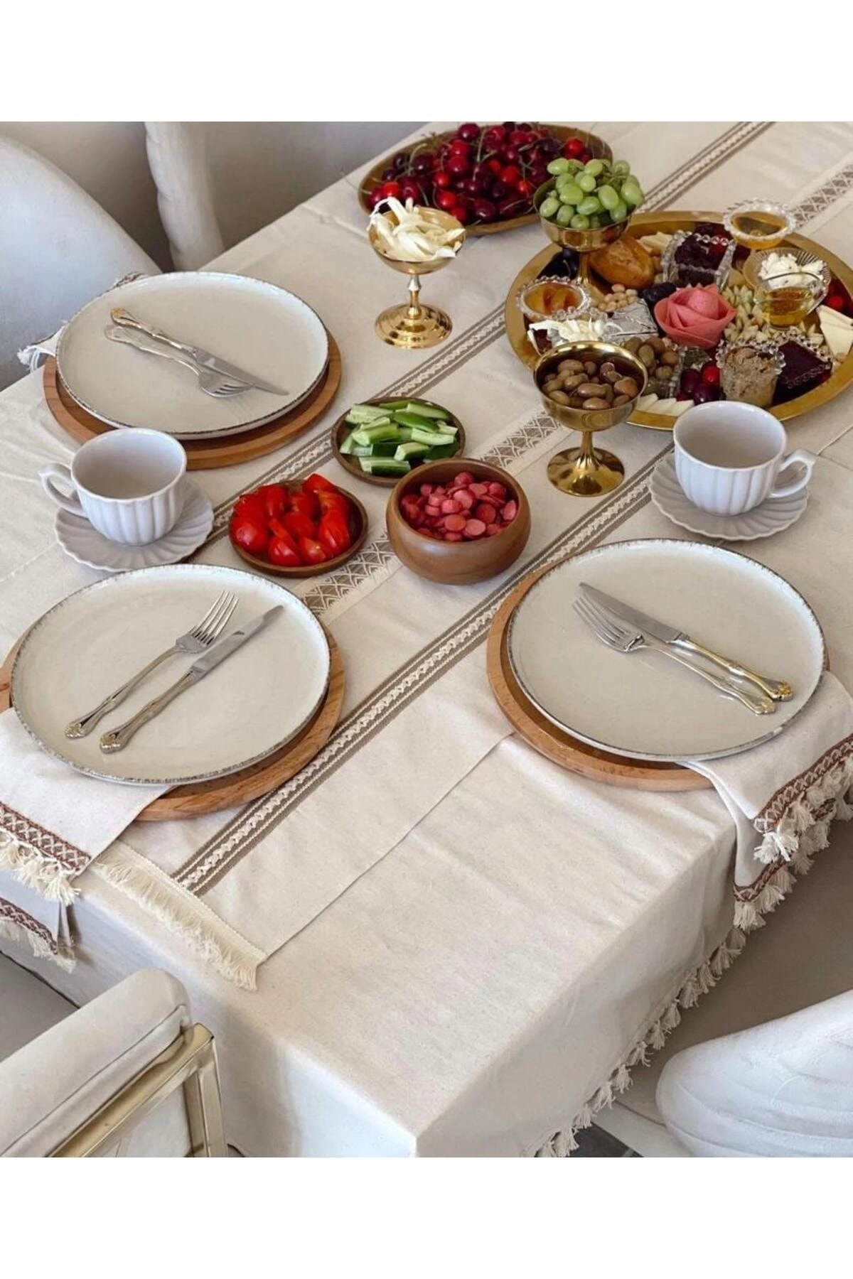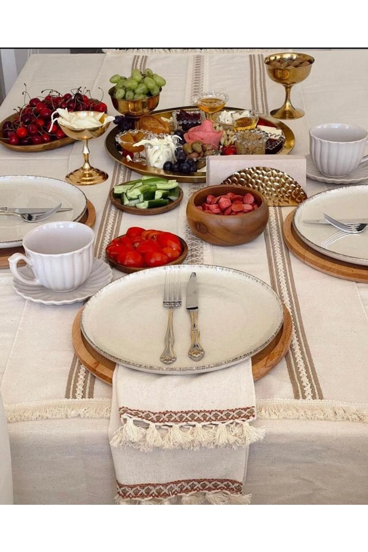 Runner yemek esnasında kullanılan ,yemek masasına şıklık katanmasa örtüleridir. ; Normal masa örtüsü üstüne serilen ,ucu düz veya zarf şeklinde,uzun dar bir biçime sahip dikdörgen görünümlü şık örtülerdir. ; Aynı desenin farklı parçalarıyla mağazamızdan kombin yapabilirsiniz. ; Kumaş:Yıkanmış dokuma kumaş .%60 keten %40 pamuk polyester,polietilen içermez. ; Dikim:Kenarları ince çift kat ince dikişli kumaş. ; El yapımı yerli üretimdir. ; Aksesuar:Kullanılan aksesuarlar kumaşa dikme yöntemiyle montelenmiştir.Ürünlerimizin hiçbirinde , yapıştırma tekniği kullanılmamaktadır. ; Aksesuarlar özel olarak dokunmuş olup, %100 pamuk'tur. ; YIKAMA:30 Derecede kısa programda kurutma yapılmadan yıkanmalıdır. ; İlk yıkamada kesesinde yıkama tavsiyemizdir. ; Ağır kimyasal içerikli deterjan kullanmayınız. ; NOT:Işıktan dolayı renklerde %5 sapma olabilir.;