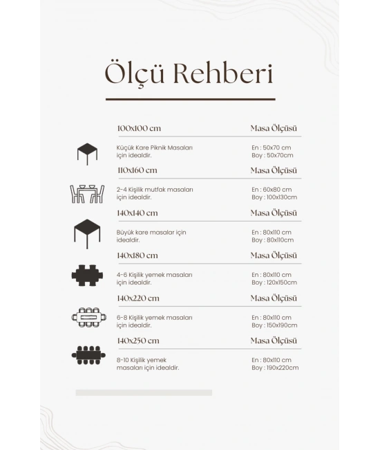 Geniş ölçü seçenekleri sayesinde küçük kahvaltı masalarından kalabalık yemek masalarına kadar her ihtiyaca uygundur.