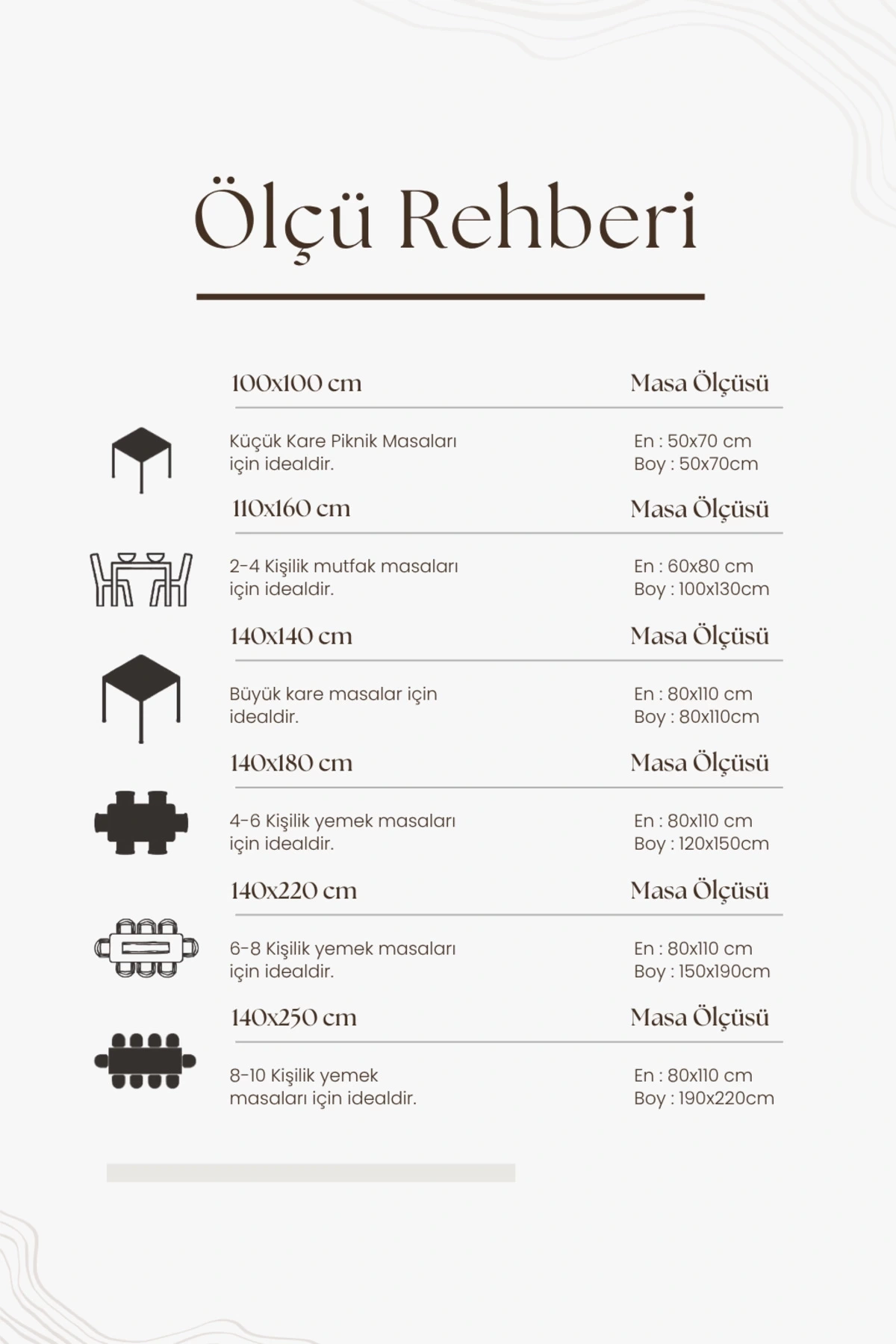 Geniş ölçü seçenekleri sayesinde küçük kahvaltı masalarından kalabalık yemek masalarına kadar her ihtiyaca uygundur.
