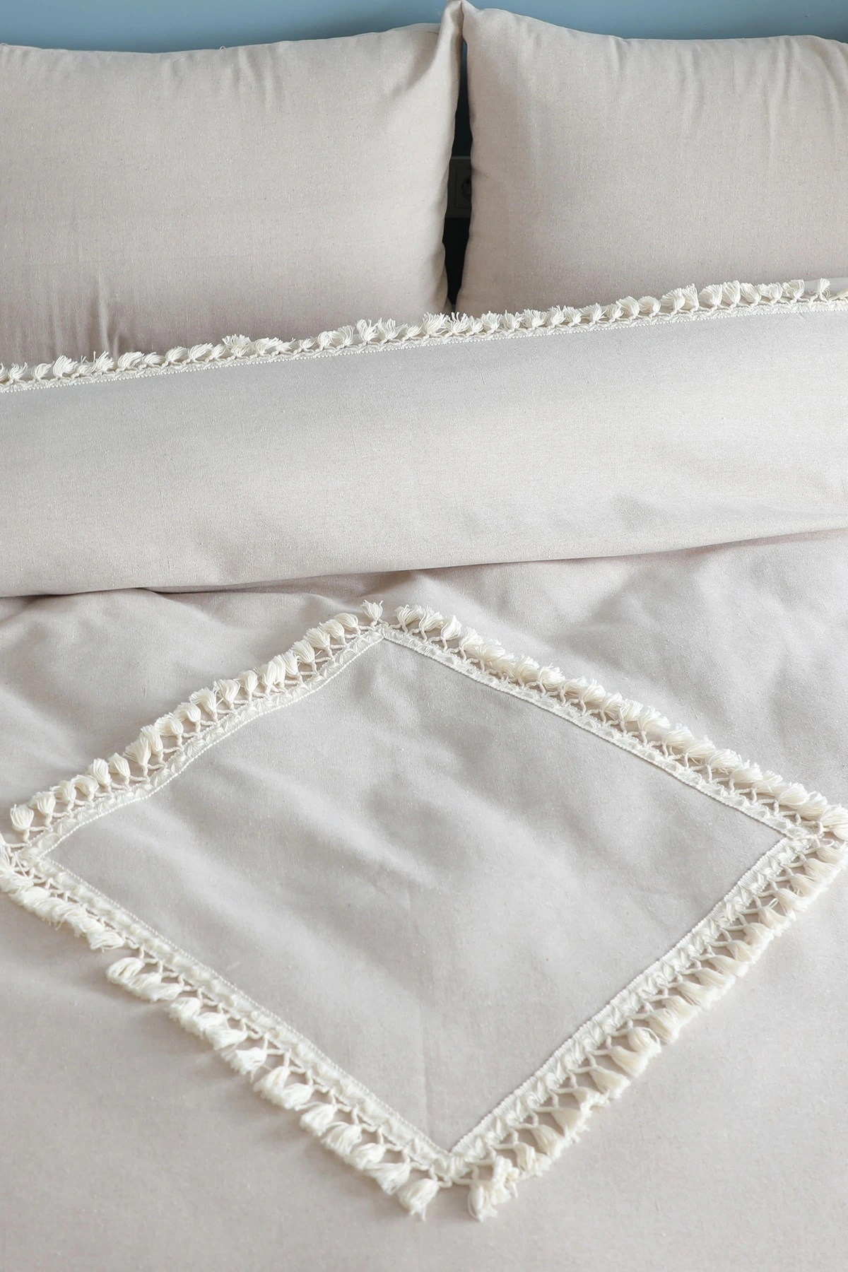 Bej Pamuk Keten Ikili Baklava Desen Ponponlu Tek Kişilik Nevresim Takımı(YEDEK YASTIKLI)