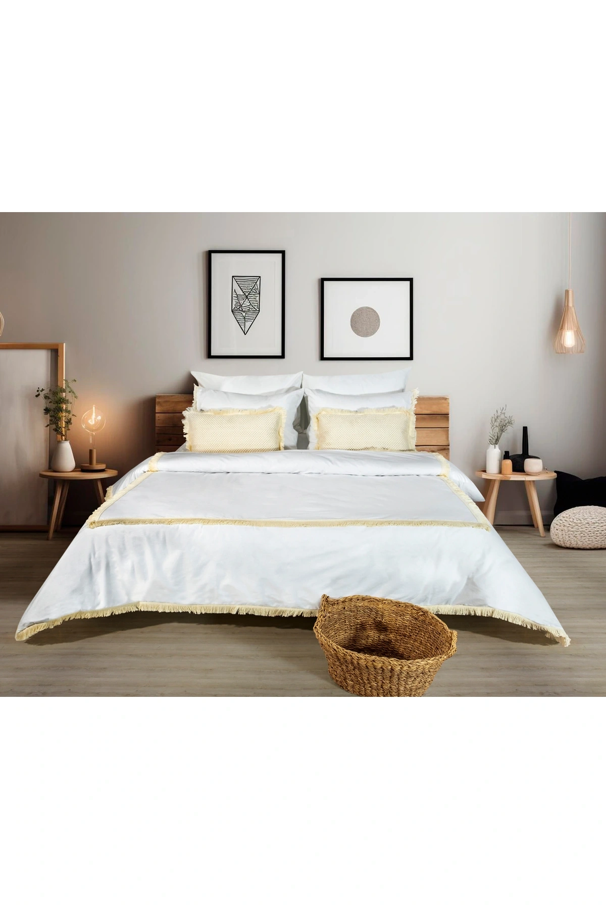 Beyaz Pamuk Keten Kare Püsküllü Tek Kişilik Nevresim Takımı