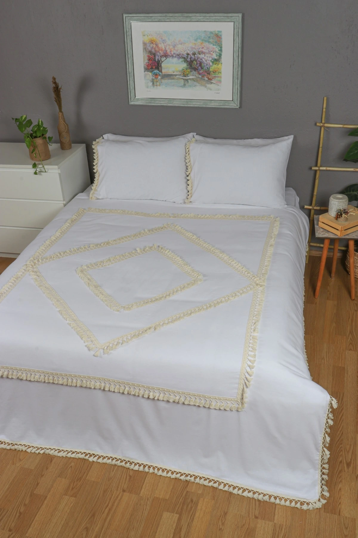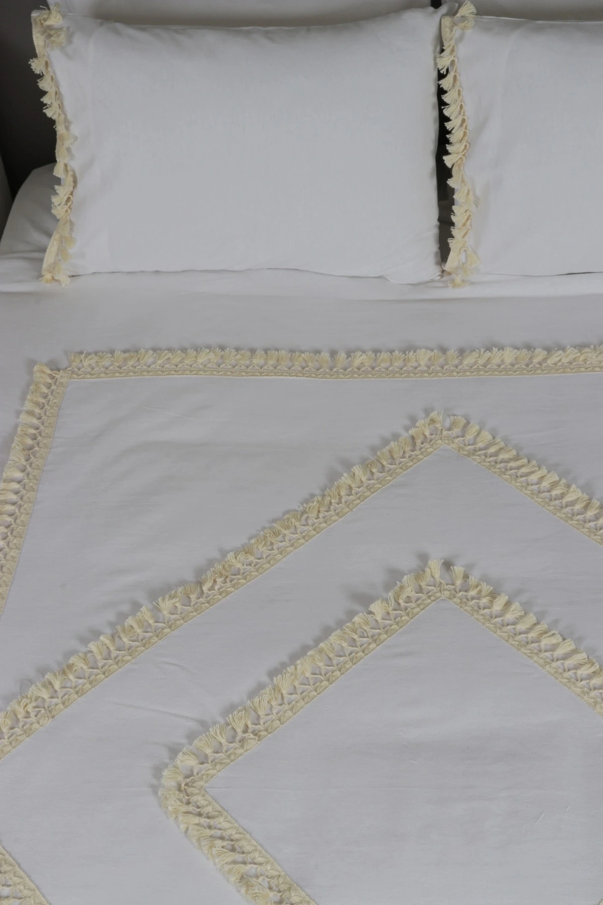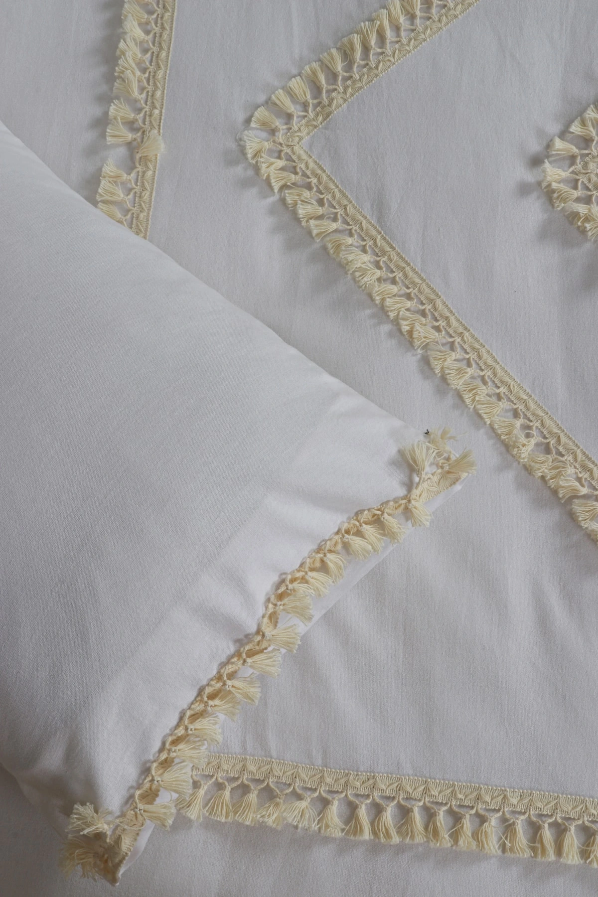 Beyaz Pamuk Keten Tek Kişilik Mozaik Ponponlu (yedek Yastıklı) Nevresim Takımı
