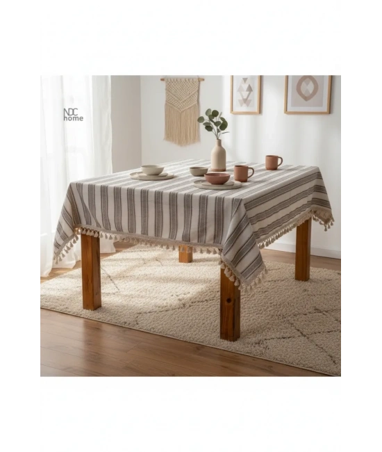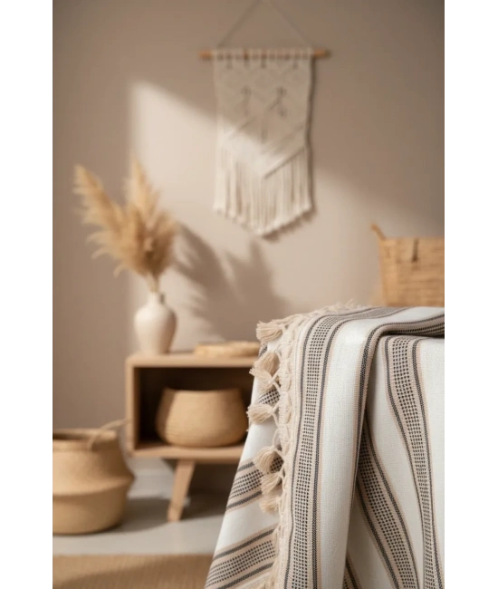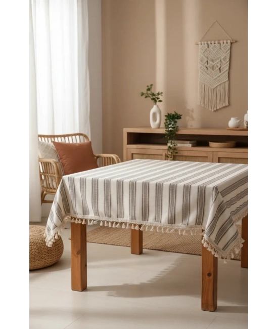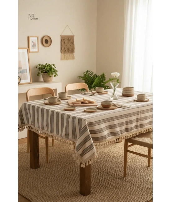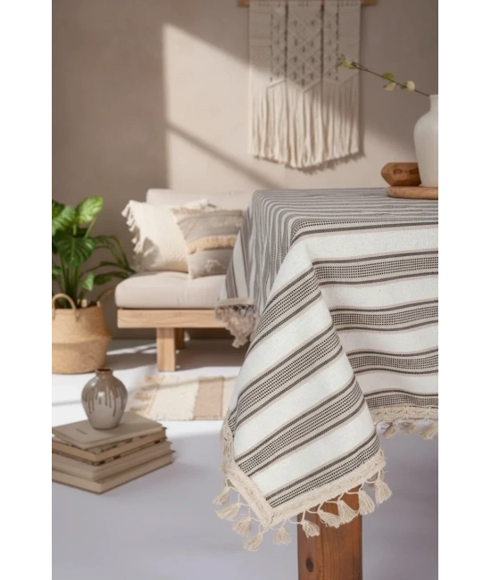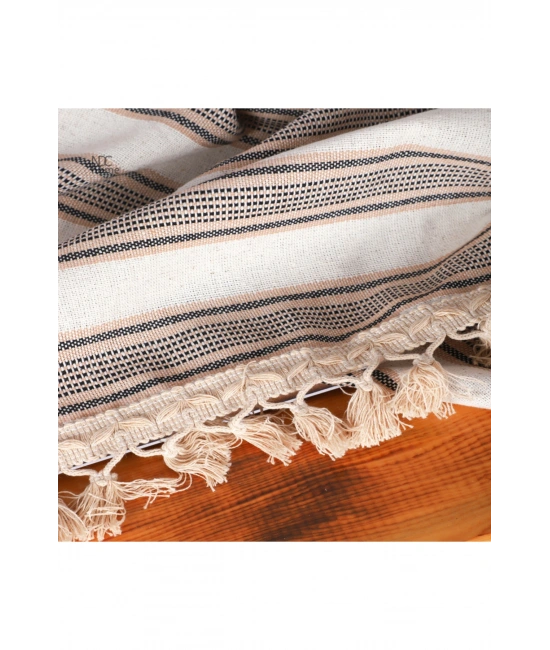 Buldan Dokuması Keten Kahverengi Çizgili Ponponlu Masa Örtüsü
