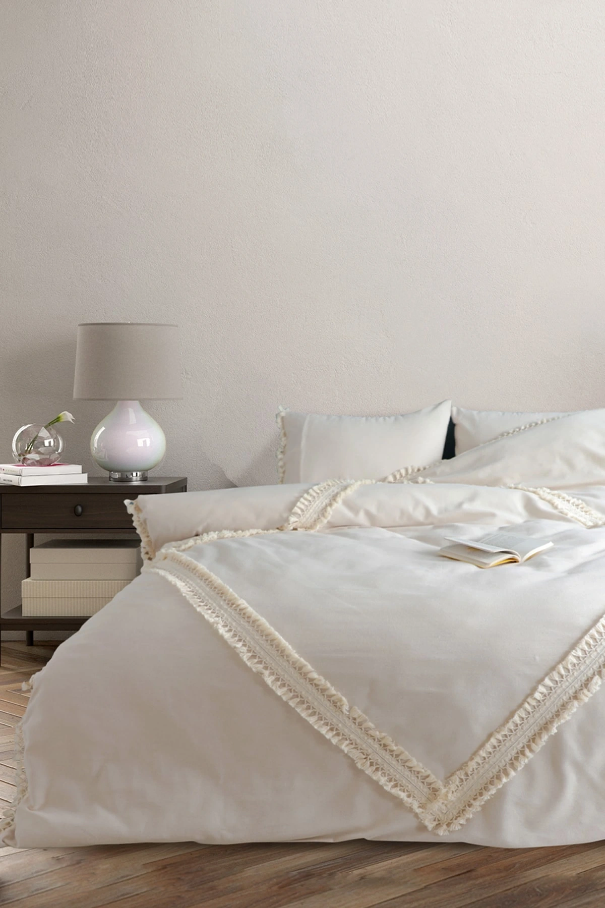 Ham Keten Baklava Desen Çift Ponponlu Tek Kişilik Nevresim Takımı