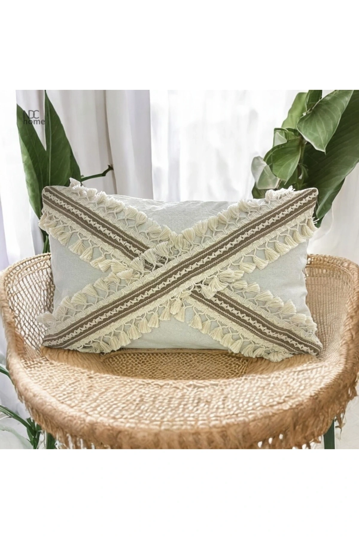 Ham Keten Baklava Mozaik Püsküllü Kırlent Kırlent Kılıfı 35x55