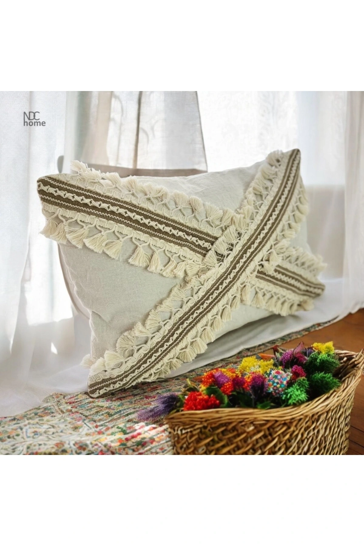 Üç Dantelli Püsküllü Ham Keten Krem Kırlent Kılıfı