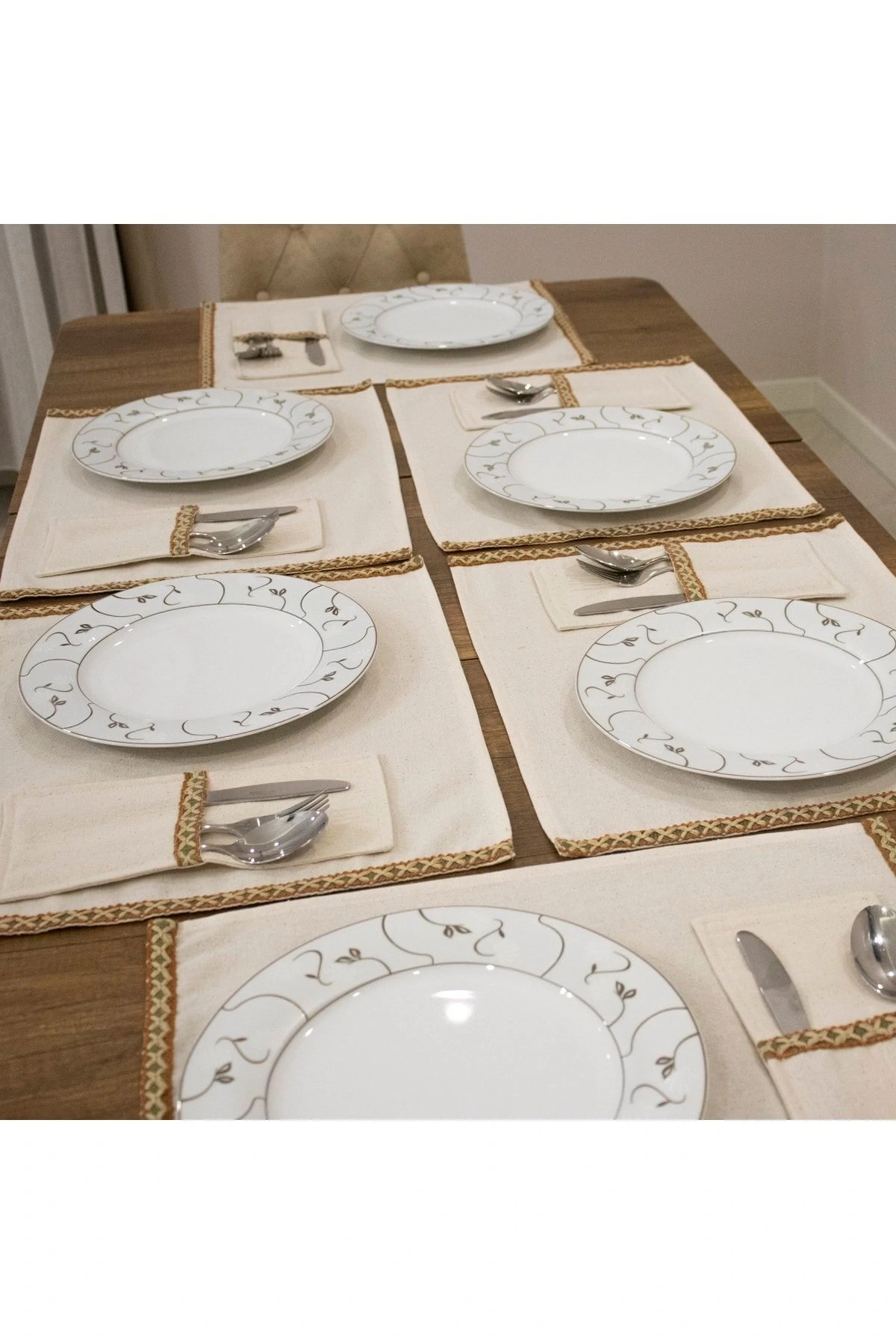 Keten 6lı Yeşil Dokuma Şeritli Amerikan Servis Seti Kaşıklık Hediyeli 35 X 55
