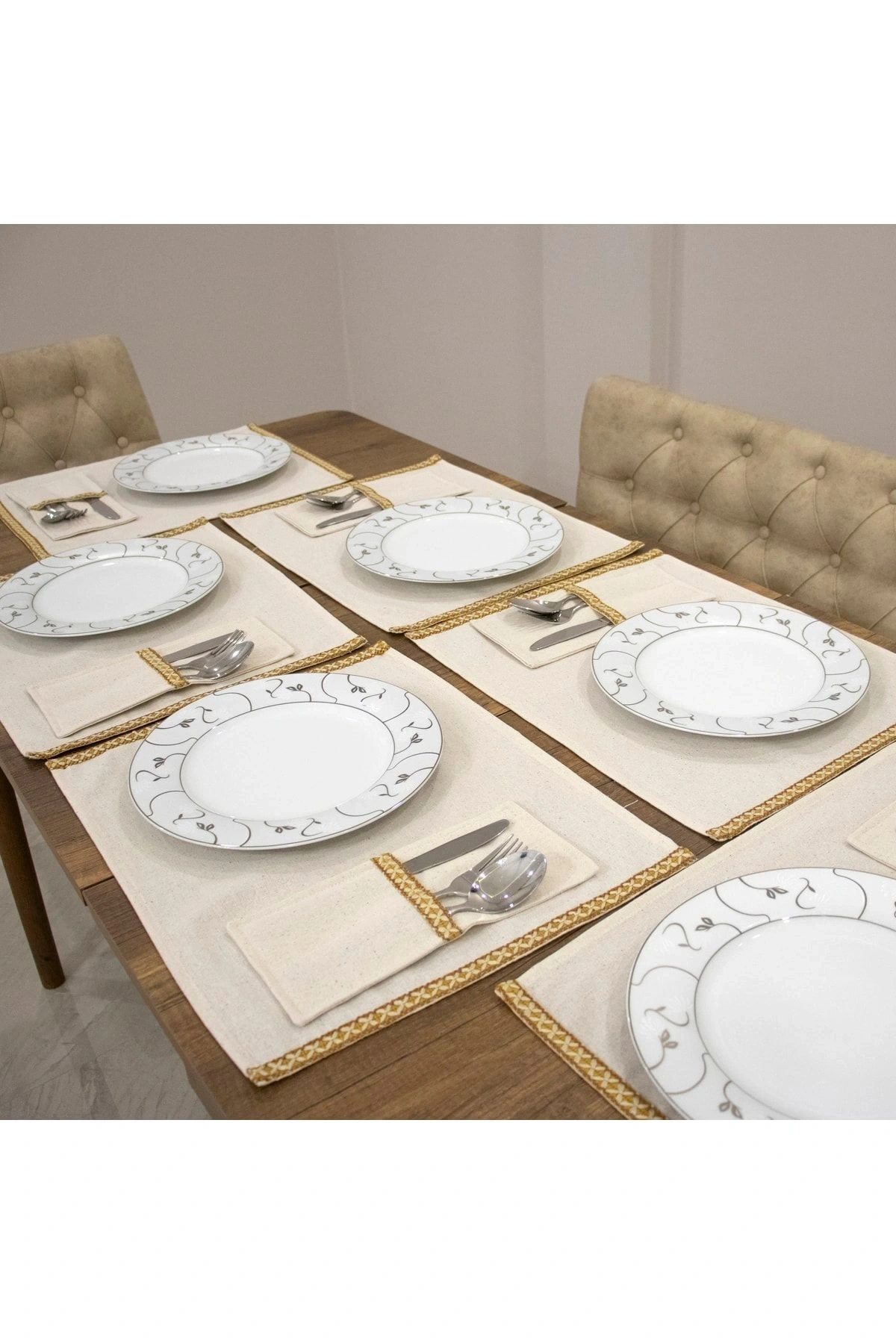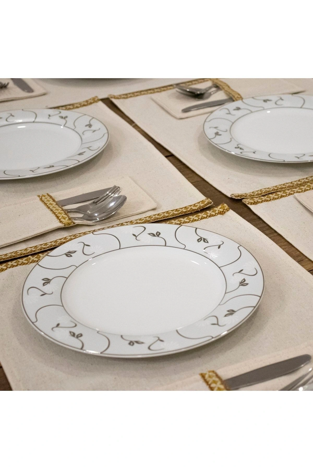 Keten Sarı Dokuma Şeritli 6lı Amerikan Servis Seti Kaşıklık Hediyeli 35x55