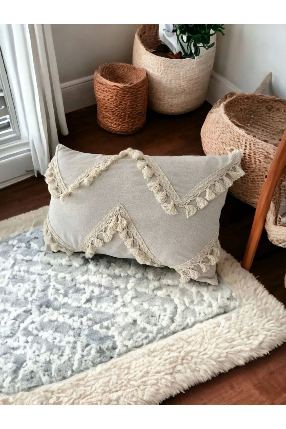 Özel Tasarım Çapraz Ponpon Tekli Keten Krem Kırlent Kılıfı(35X55)