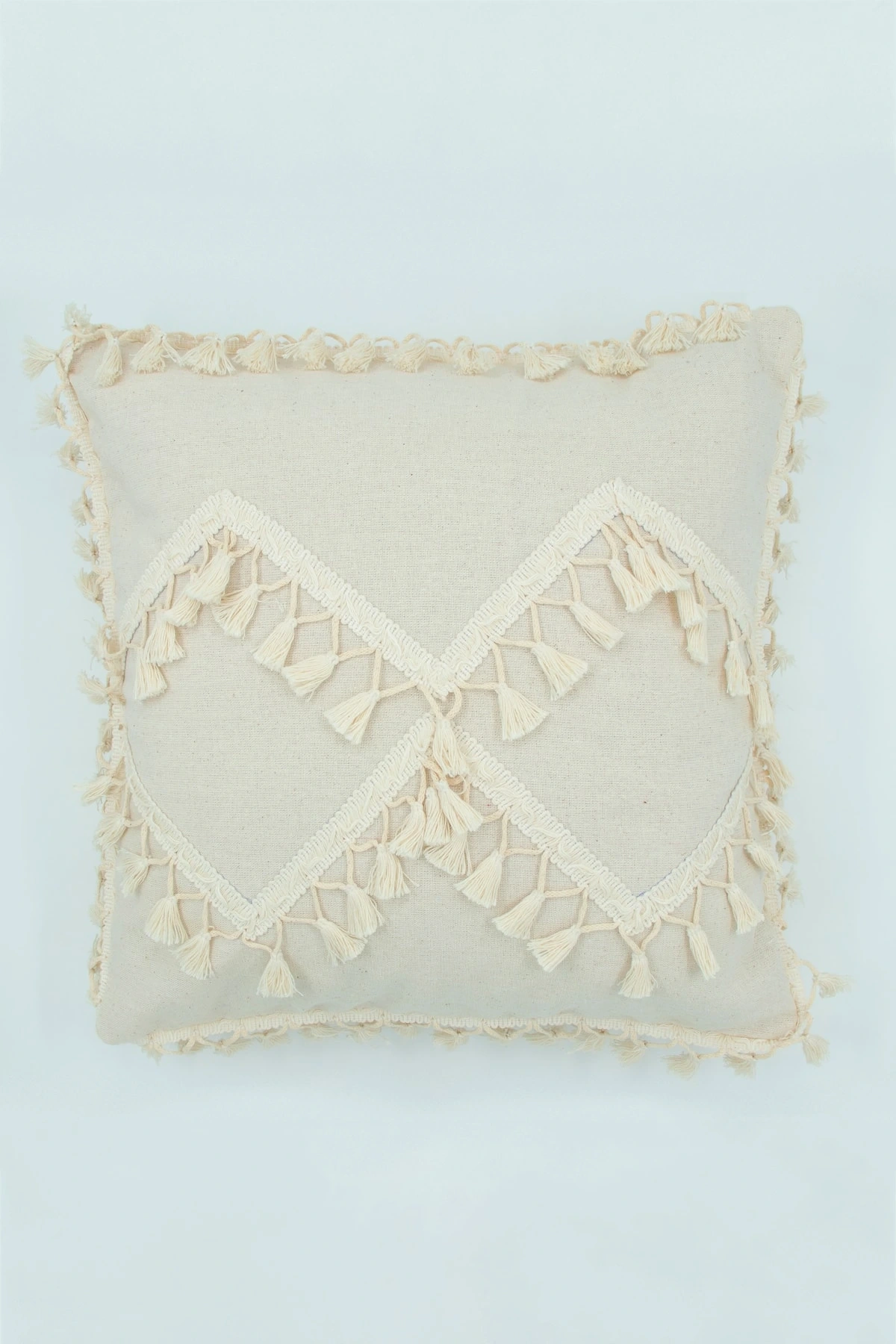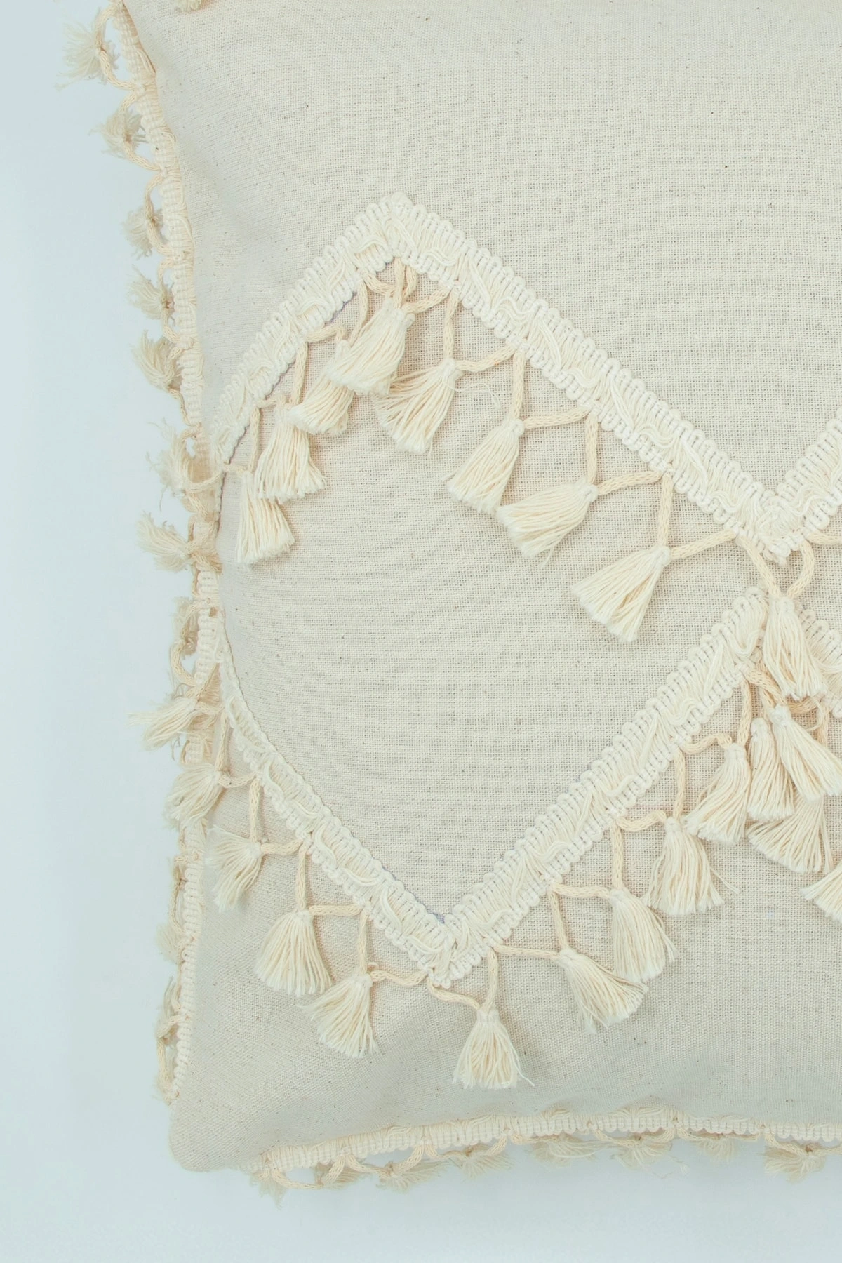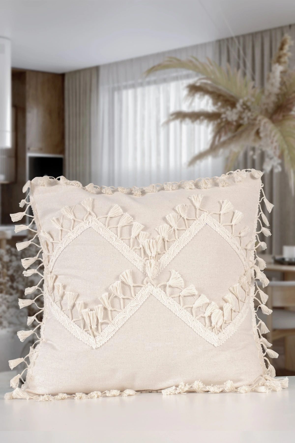 Özel Tasarım Çapraz Ponponlu Tekli Keten Krem Kırlent Kılıfı(45X55)