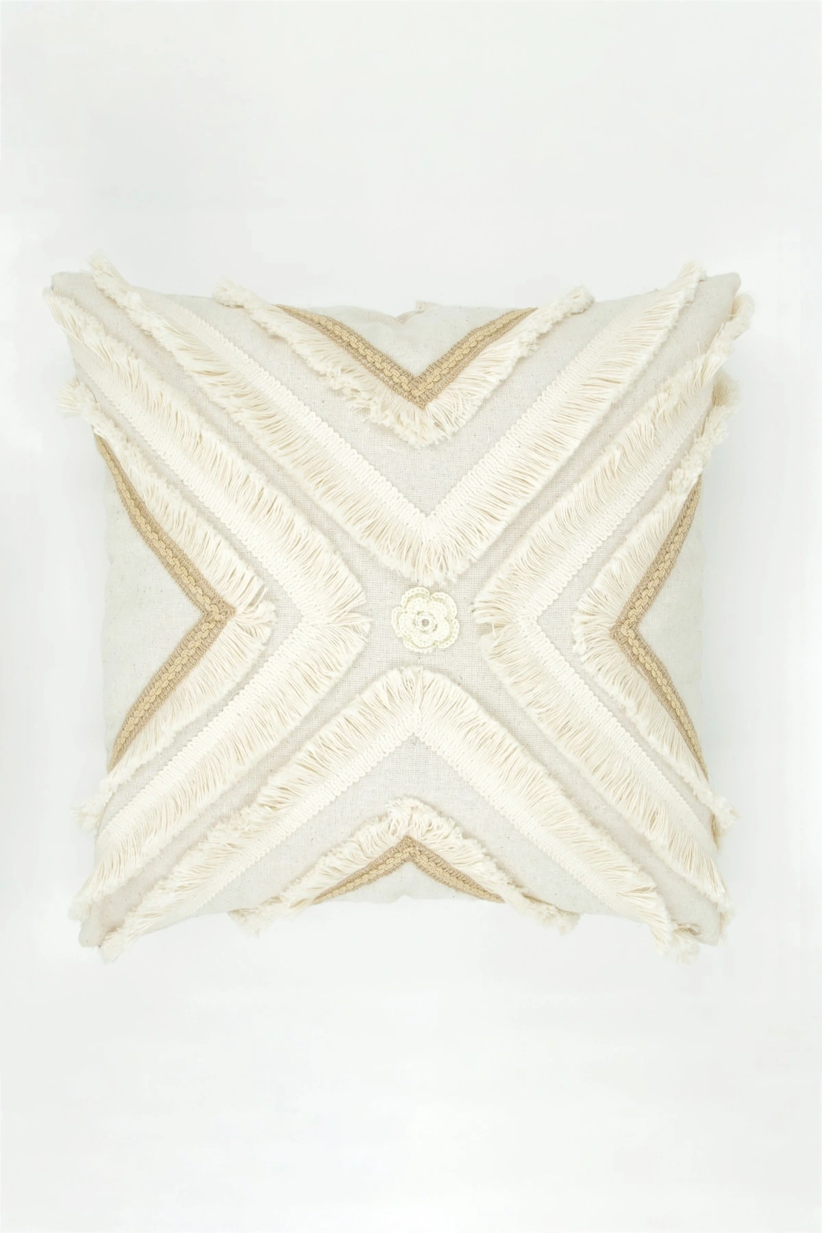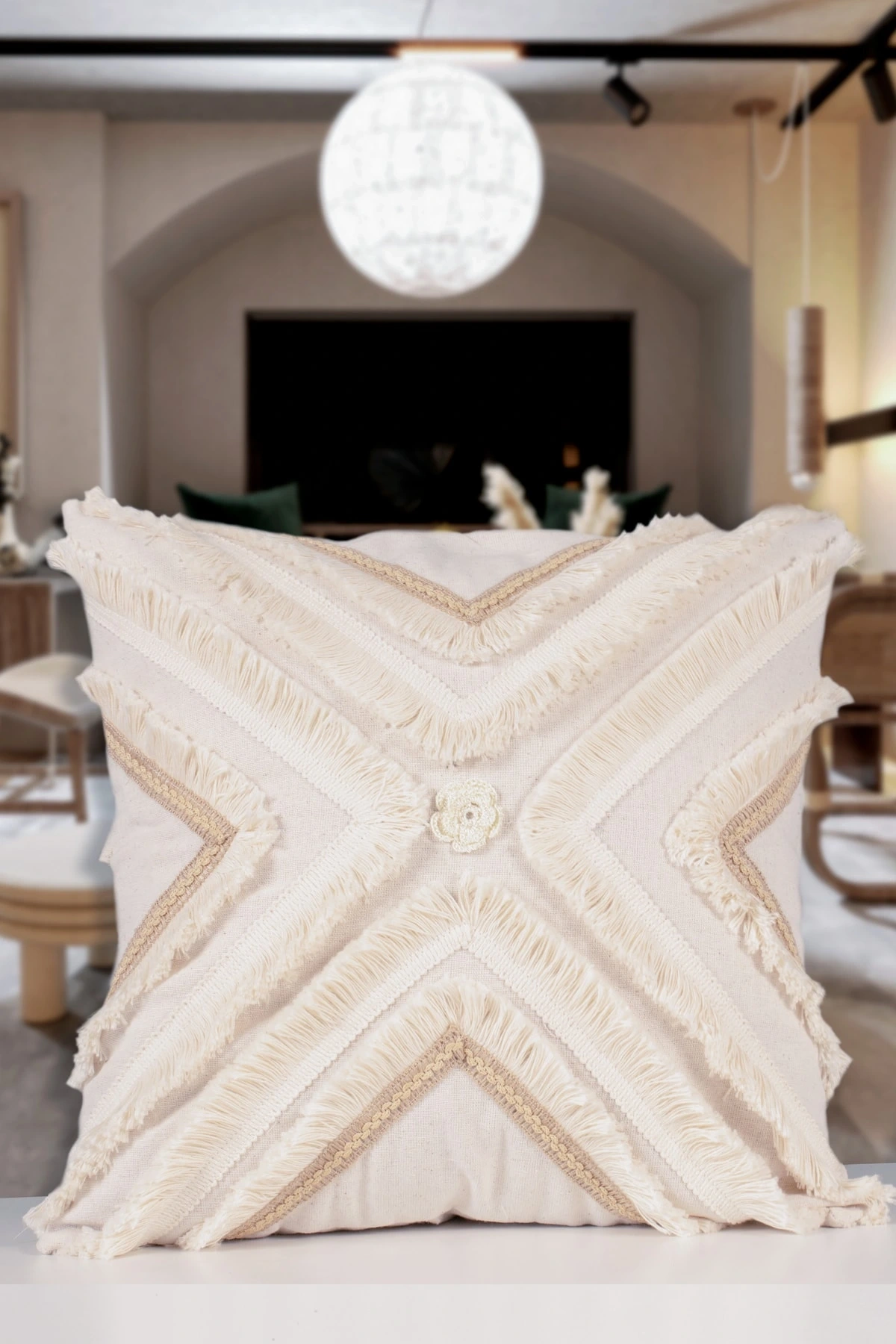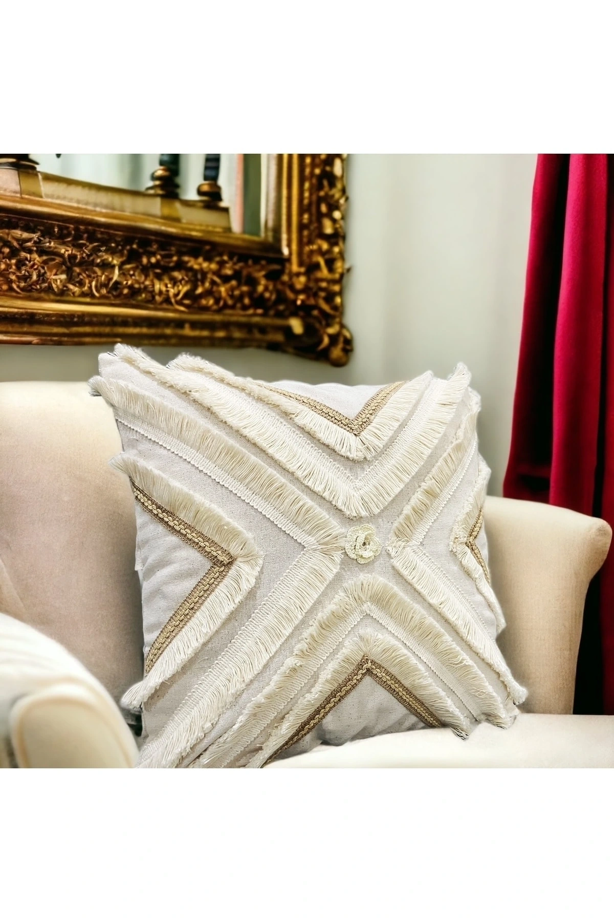Özel Tasarım Çoklu Püsküllü Motifli Tekli Keten Krem Kırlent Kılıfı (43X43)