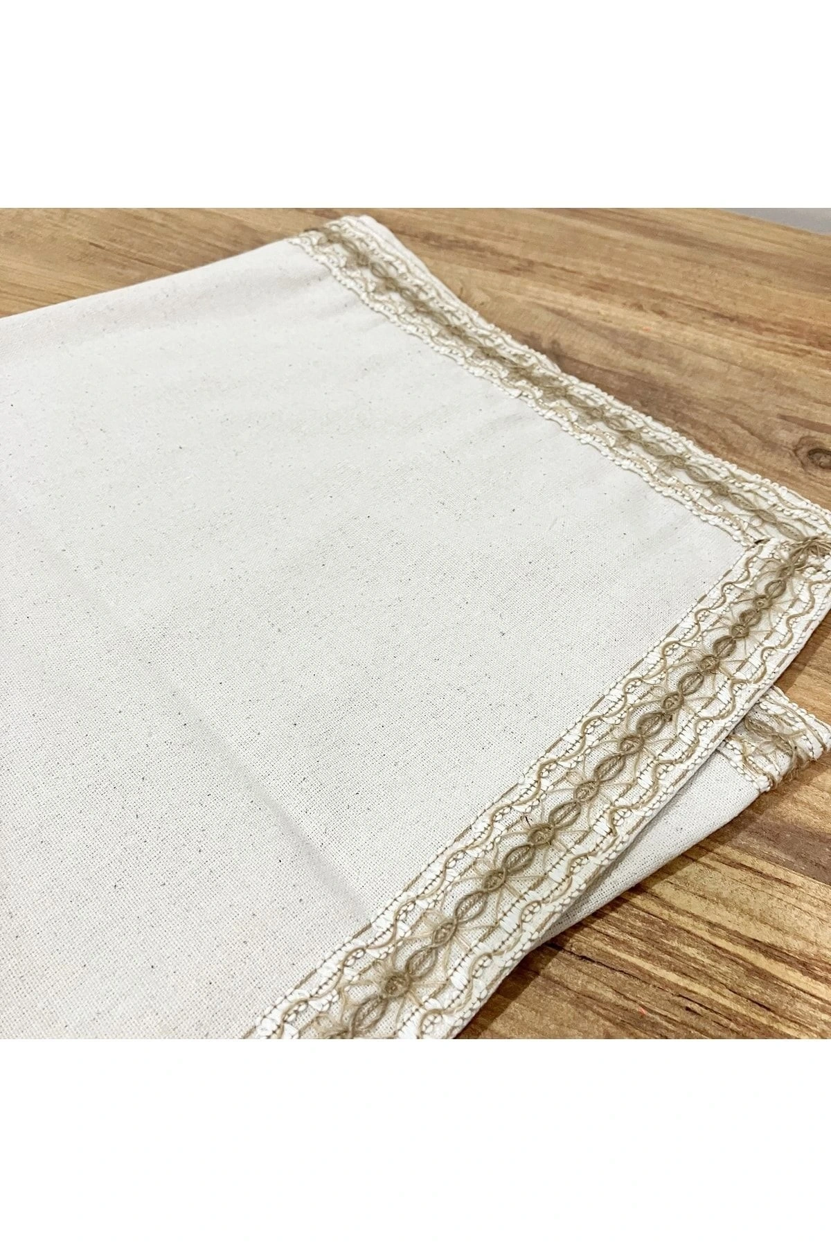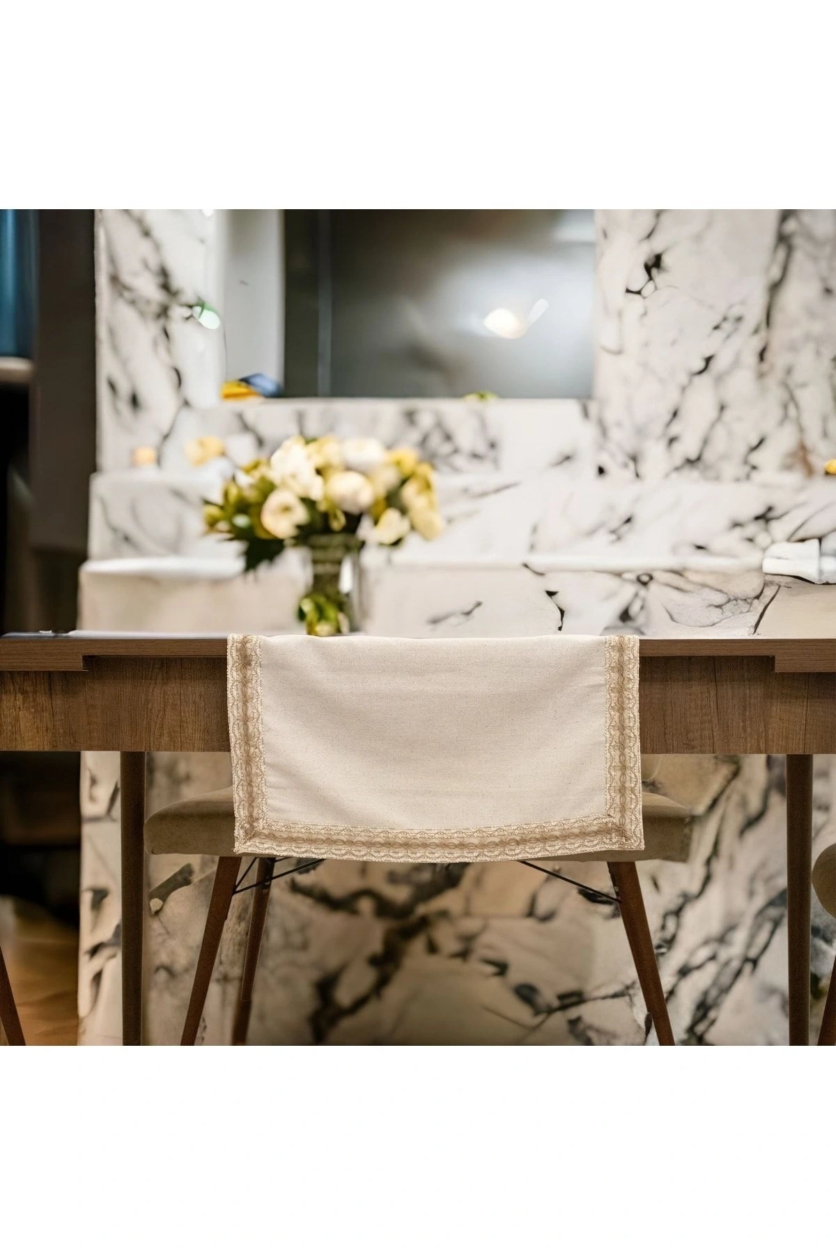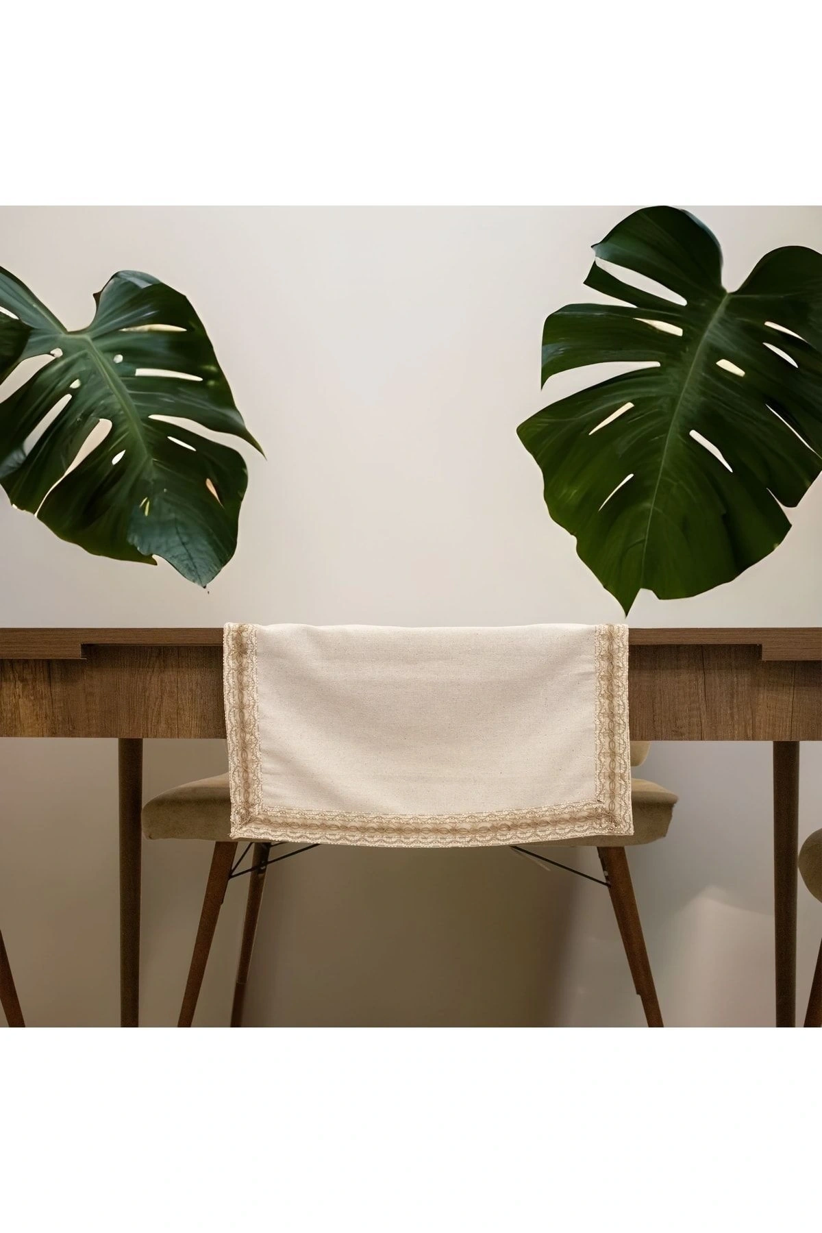 Özel Tasarım Organik Keten Krem Kum Rengi Dantelli Runner Masa Örtüsü 45 X 150