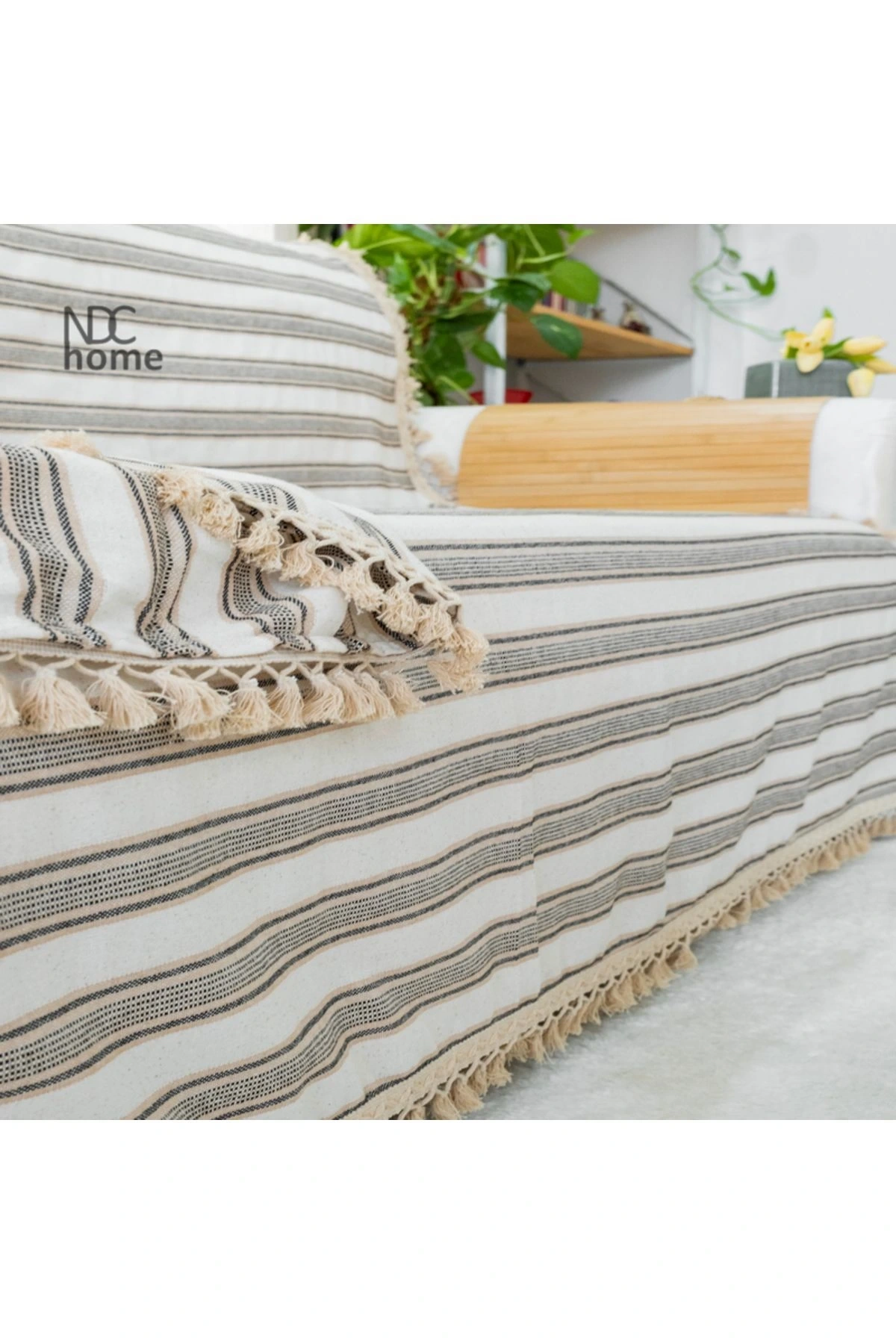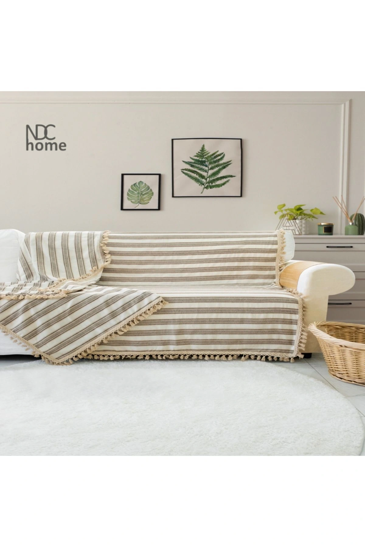 Premium Keten Kahverengi Çizgili Bej Ponponlu Koltuk Örtüsü (170 x 220)