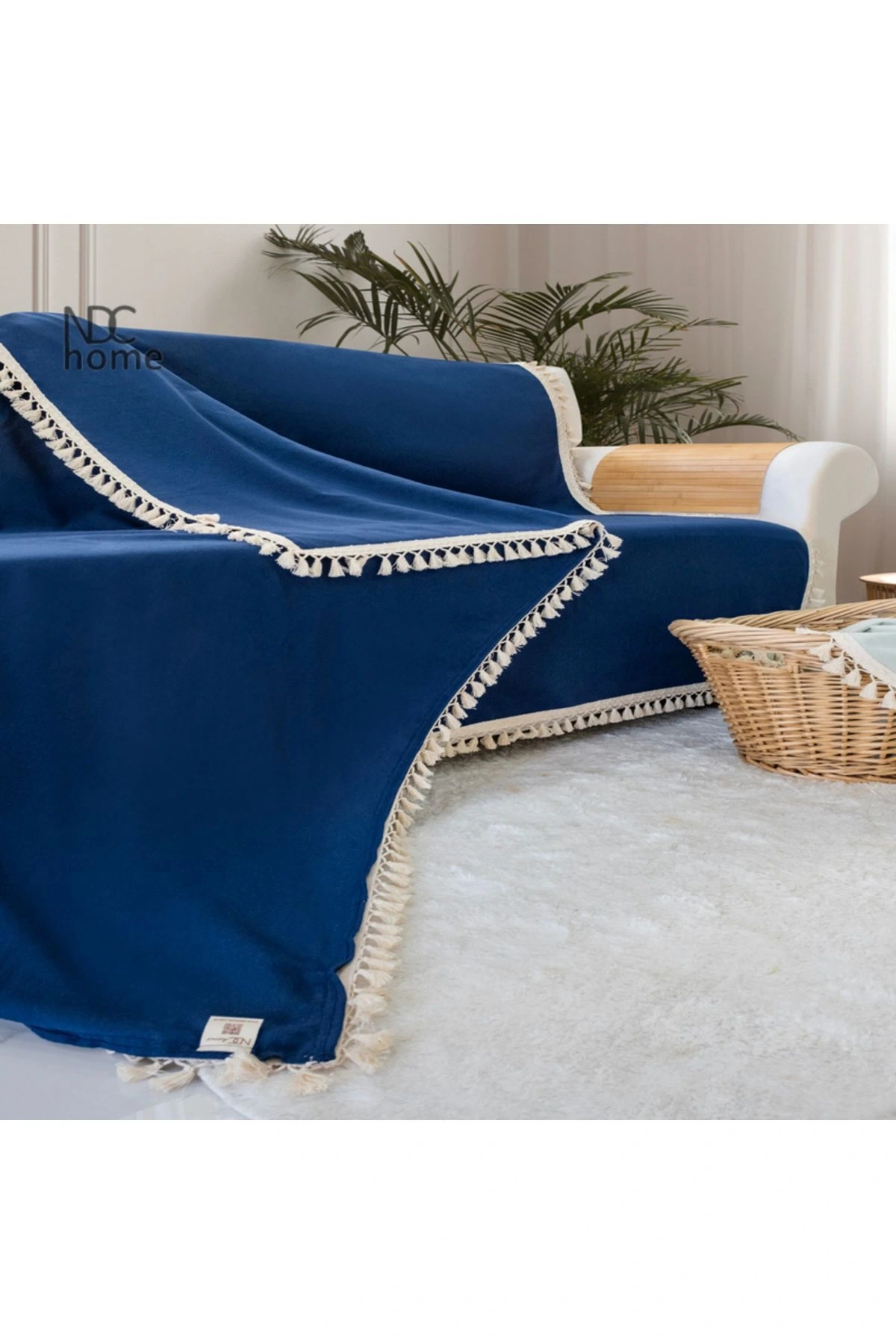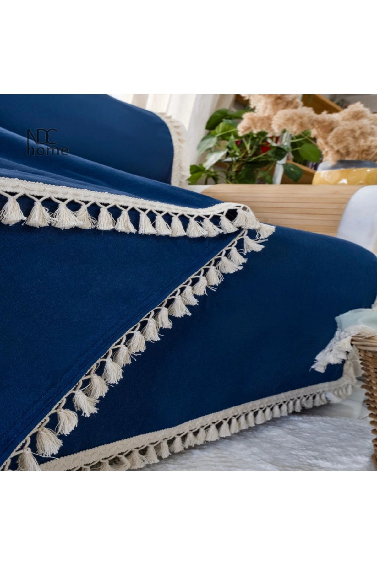 Premium Keten Lacivert Ponponlu Koltuk Örtüsü (170 x 220)