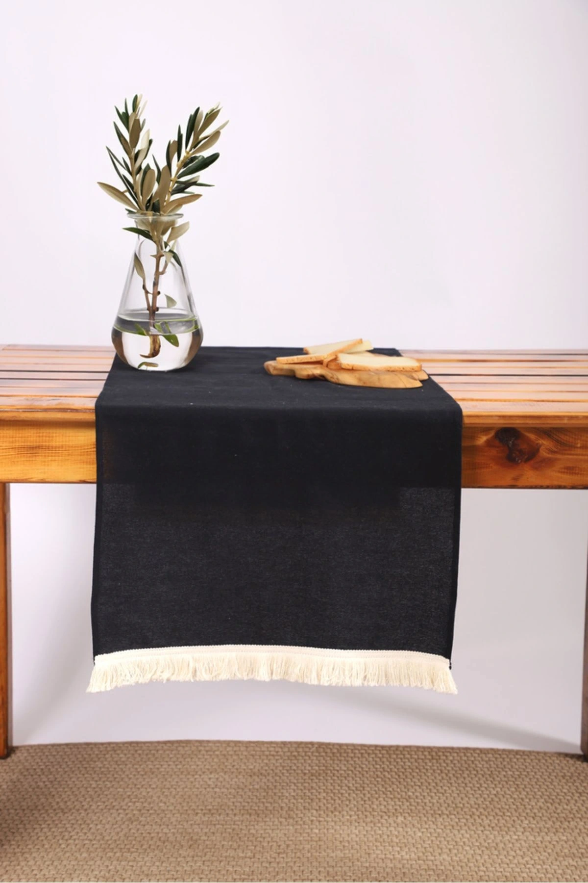 Premium Keten Siyah Püsküllü Runner Masa Örtüsü(45 x 150)